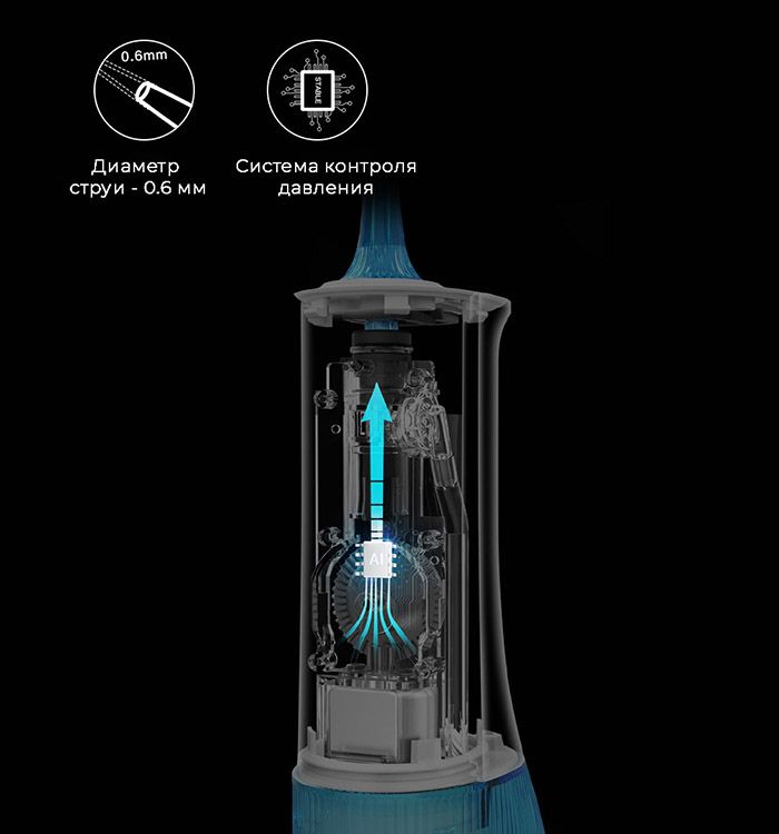 Xiaomi Soocas W3 Pro оснащен собственным интеллектуальным чипом, который точно контролирует рабочее давление устройства и обеспечивает подачу стабильной струи воды диаметром 0.6 мм. Благодаря высокому давлению, такая струя проникает даже в самые труднодоступные места и производит тщательную очистку полости рта.